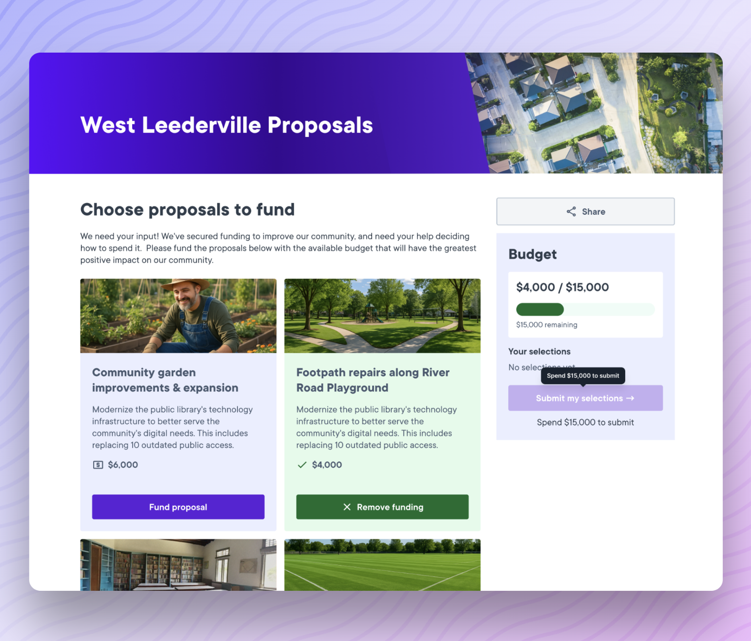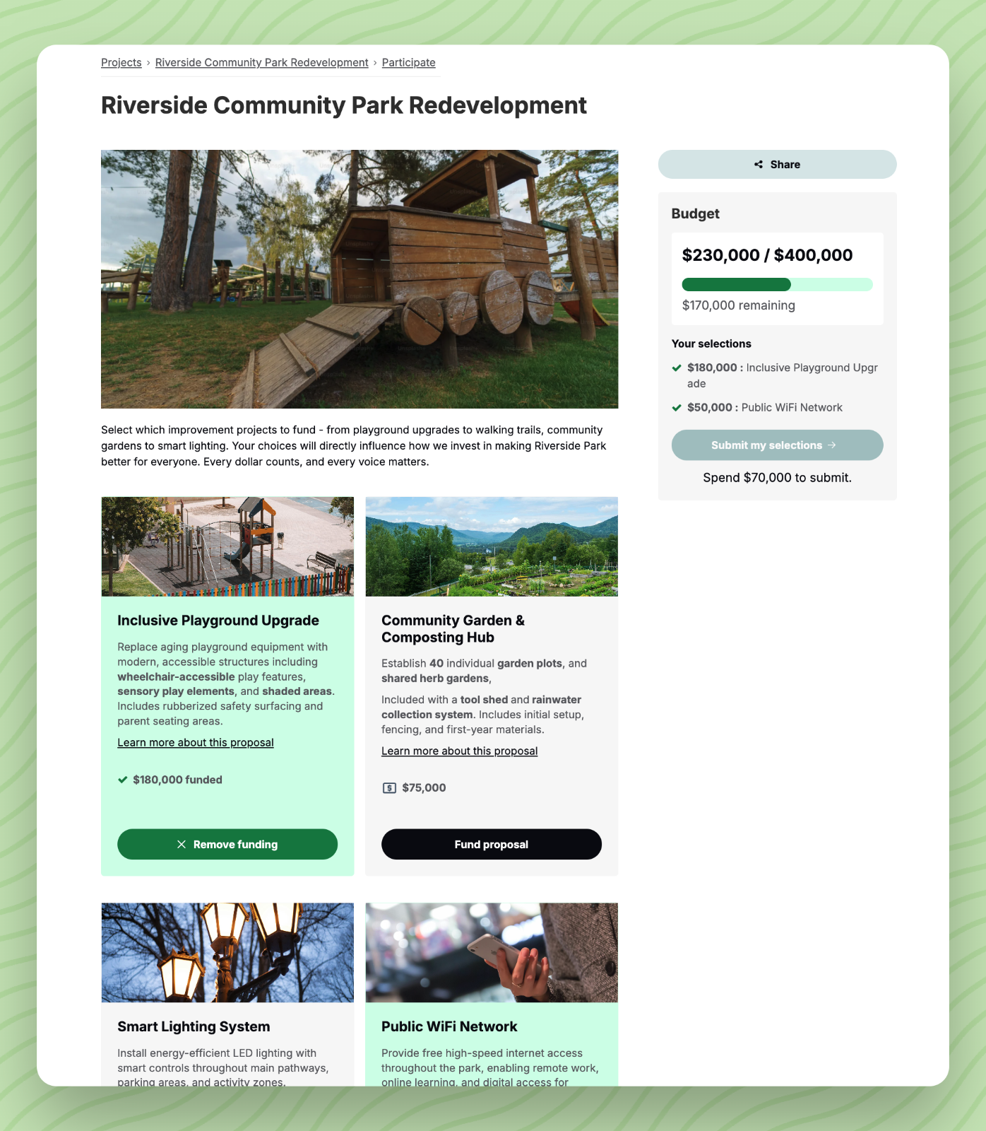 Whether you're running a traditional participatory budgeting program, allocating community grants, or seeking input on priorities, the Budgets tool provides an intuitive way for community members to make their voices heard.