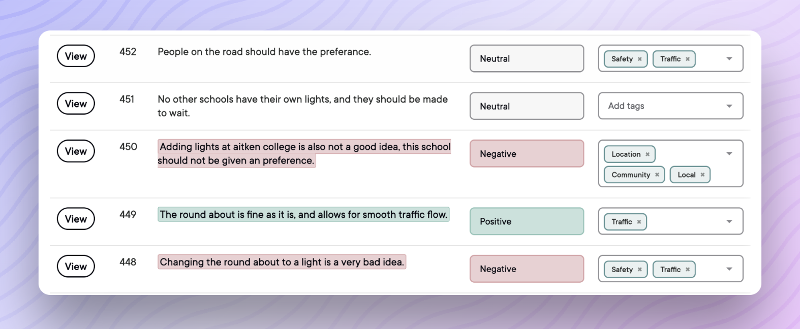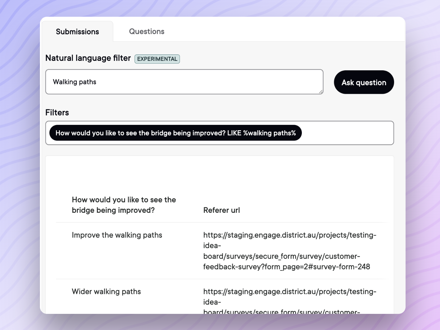 - Ask questions in plain English like "people who support the new park" or "submissions from residents aged 25-40"