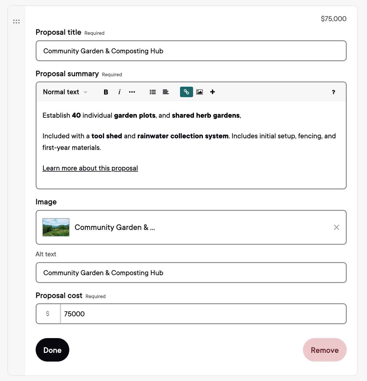 - Create and manage budget proposals with rich descriptions and imagery