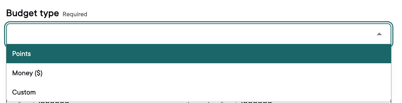 When setting up your Budgets tool, you can choose between Money ($), Points, or a Custom unit. Each option may create a different experience for participants.
