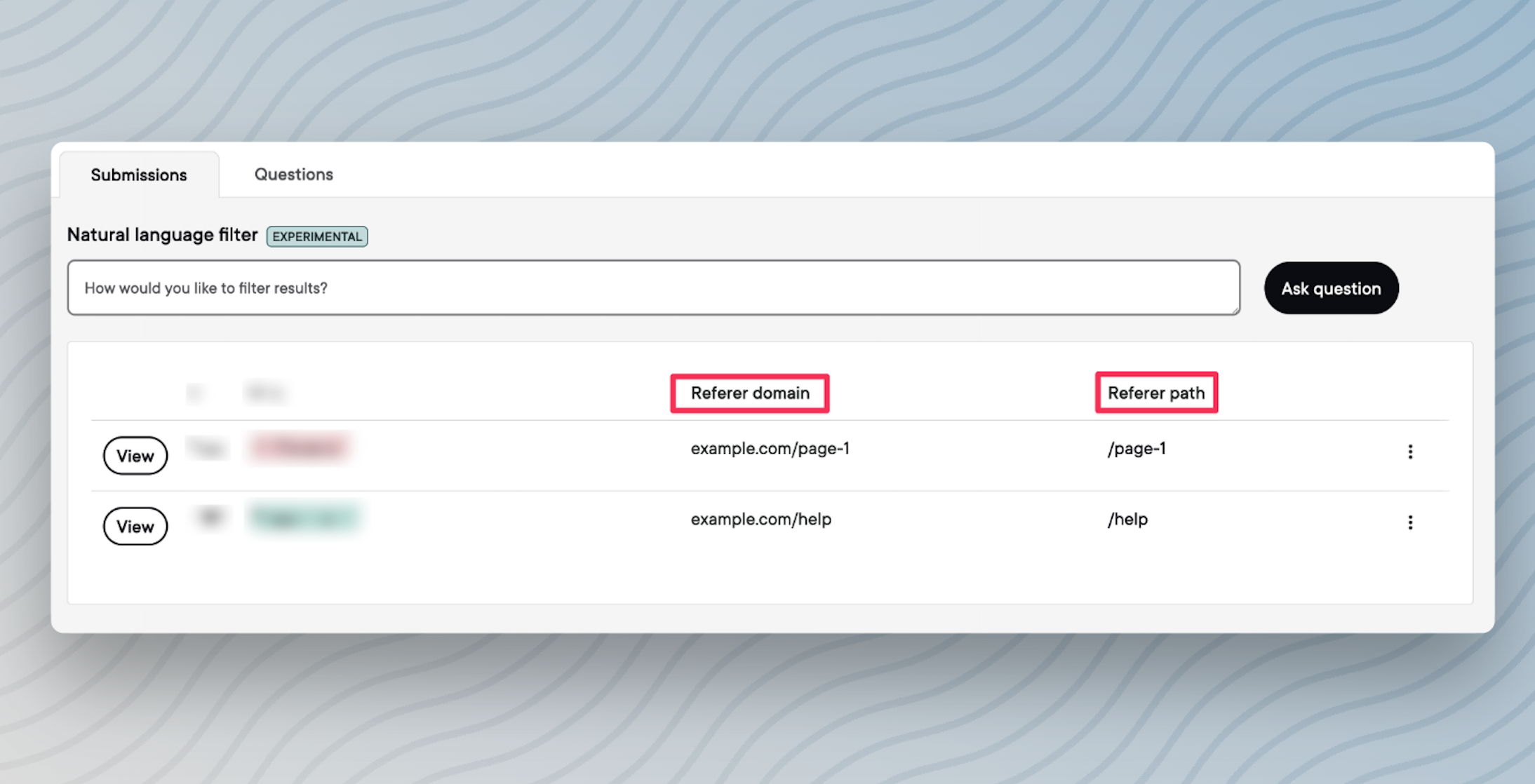 - View the Referrer Domain and Referrer Path for each submission in the submissions table