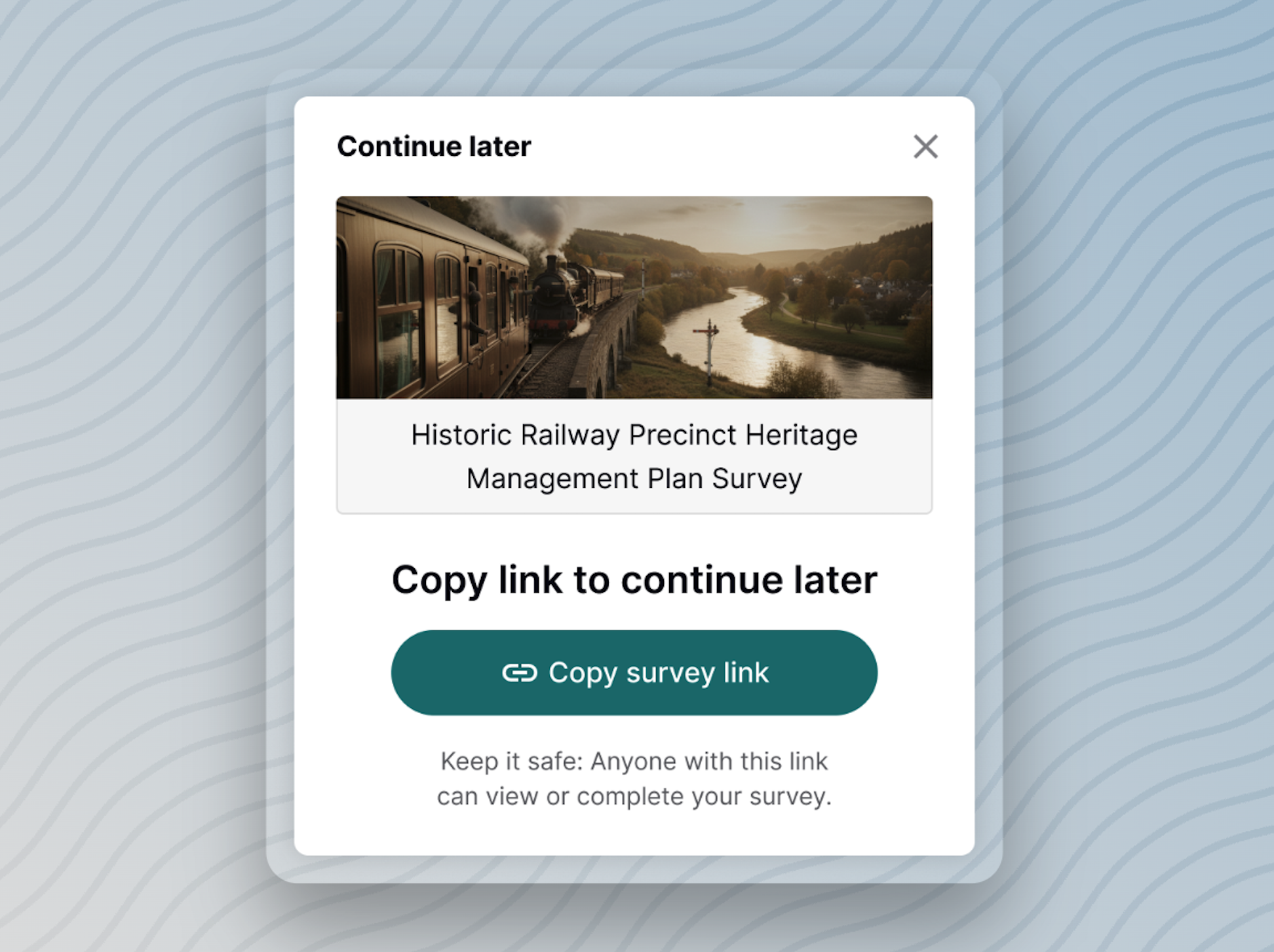 Participants who are not logged in can click Finish later to save their progress. They receive a unique link that allows them to return and continue the survey on any device. Any changes made in future sessions are automatically saved when the browser is closed.
